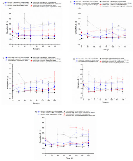 However, despite the general trend, the rare cases when the elongation values of A. terreus fully evolved pellets in the coculture were close to the values from the corresponding monoculture or even higher occurred in the experiments from ATSR2 to ATSR6. Nevertheless, they were not statistically significant, which shows the example of 120 h of ATSR5 (coculture E = 1.37; monoculture E = 1.54; p > 0.05). Furthermore, the values presented in Figure 4 and Table 3 proved the lack of influence of the change of cultivation medium on the elongation A. terreus fully evolved pellets from ATSR2 to ATSR6 experiments.