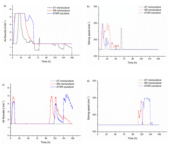 Figure 8 shows the temporal changes of air flowrate and stirring speed in ATSR2 (Figure 8a,b) and ATSR6 (Figure 8c,d). In ATSR2, the most intensive aeration and agitation occurred in the first period of the experiment. The maximum air flowrate 5.5 lair min−1 was achieved almost immediately after the inoculation of S. rimosus monoculture and coculture (Figure 8a), and was required to hold the desired level of dissolved oxygen at 20%. It also reflected the relatively fast growth of S. rimosus due to glucose consumption (Boruta et al., 2021). The decrease in the air flowrate began after 36 h of these cultivations. In ATSR2 A. terreus monoculture, the maximum air flowrate was observed in the shorter period, between 17 and 22 h of the process. Stirring speed (Figure 8b) increased to its maximum value of 300 min−1 within 10 h of S. rimosus monoculture and 11 h of coculture. In the ATSR2 A. terreus monoculture, the first significant increase in stirring speed appeared in 20 h (255 min−1) and its maximum value equal to 284 min−1 was obtained in 63 h. After 77 h of ATSR2, both air flowrate and stirring speed remained at the lowest permissible levels in A. terreus monoculture. Regarding the experiment ATSR6, the changes of air flowrate and stirring speed were different in comparison to ATSR2. Apart from the temporary air flowrate increase in the first day of ATSR6 coculture and S. rimosus monoculture, the most intensive aeration (Figure 8c) and agitation (Figure 8d) occurred after 96 h of ATSR6. This was connected with the delayed consumption of lactose, being the sole carbon source in this experiment, by S. rimosus (Boruta et al., 2021). In this experiment, the maximum air flowrate was observed at 111 h of S. rimosus monoculture (5.0 lair min−1) and at 153 h of the coculture (5.0 lair min−1). In A. terreus monoculture, air flowrate remained at 1.5 lair min−1 without any changes. Stirring-speed temporal changes in ATSR6 showed a similar course (Figure 8d). In A. terreus monoculture, its value was at the lowest set level equal to 220 min−1 throughout the experiment. The highest stirring speed appeared in 118 h of S. rimosus monoculture (292 min−1) and between 130 and 138 h of the coculture (300 min−1). Connecting the aforementioned aeration and agitation data (Figure 8) with the size of mycelial objects defined by the projected area (Figure 2a,e), it can be found that the increase in air flowrate and stirring speed in the conducted experiments led to the formation of the dispersed hyphae and clump forms. In ATSR2 S. rimosus monoculture and in the coculture, in which aeration (Figure 8a) and agitation (Figure 8b) were the most intensive at the beginning of the experiment, the hyphae and clumps’ fraction appeared relatively quickly, within 24 h of the experiment. On the other hand, in ATSR6 S. rimosus monoculture and the coculture, in which the initial increase in the air flowrate (Figure 8c) and stirring speed (Figure 8d) were not as intensive as in ATSR2, the hyphae and clumps’ fraction was noticed only in 96 h. In ATSR2 (Figure 2a) and ATSR6 (Figure 2e) runs of A. terreus monocultures, dispersed morphological objects appeared in 48 h. The same time point of the hyphae and clumps’ fraction appearance indicated that the mechanical forces caused by applied air flowrate and stirring speed (Figure 8) were too weak to introduce any drastic changes in A. terreus morphology. Moreover, the courses of air flowrate changes in S. rimosus monoculture and coculture were analogous in both ATSR2 and ATSR6. These similarities between the S. rimosus monoculture and the coculture confirmed the advantage of S. rimosus over A. terreus, which was proven previously within our quantitative morphological analysis.
