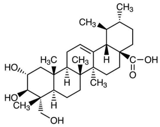 - Garo, E.; Eldridge, G.R.; Goering, M.G.; DeLancey Pulcini, E.; Hamilton, M.A.; Costerton, J.W.; James, G.A. Asiatic acid and corosolic acid enhance the susceptibility of Pseudomonas aeruginosa biofilms to tobramycin. Antimicrob. Agents Chemother. 2007, 51, 1813–1817. [Google Scholar] [CrossRef] [PubMed] [Green Version]