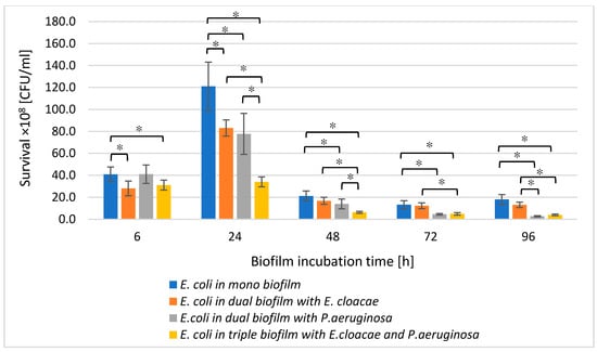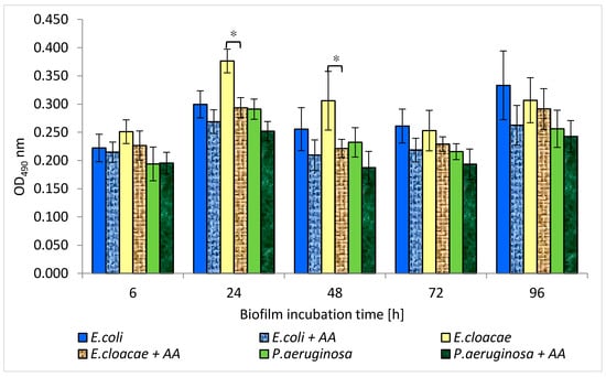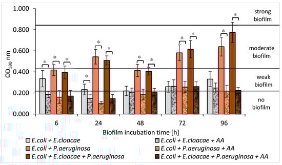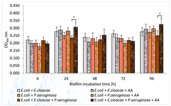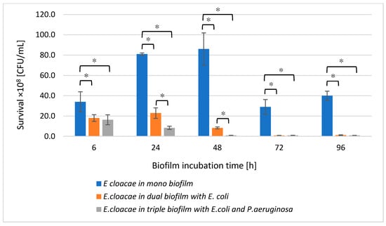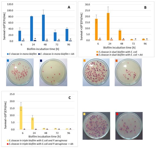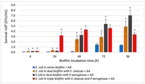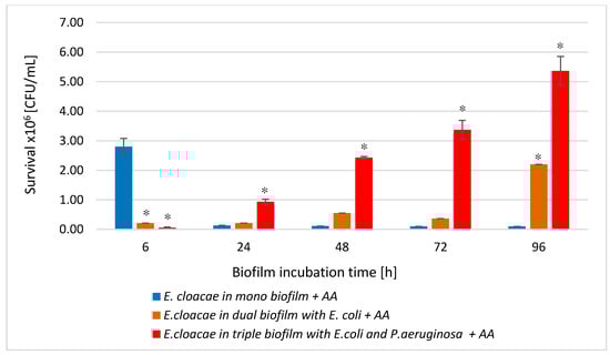 3.3. The E. cloacae Cell Count in Mono-, Dual- and Triple-Species Biofilms Untreated with AA
