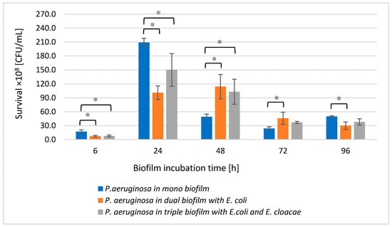 - Kuznetsova, M.V.; Maslennikova, I.L.; Karpunina, T.I.; Nesterova, L.Y.; Demakov, V.A. Interactions of Pseudomonas aeruginosa in predominant biofilm or planktonic forms of existence in mixed culture with Escherichia coli in vitro. Can. J. Microbiol. 2013, 59, 604–610. [Google Scholar] [CrossRef]