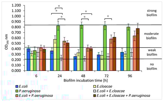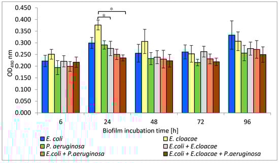 - Culotti, A.; Packman, A.I. Pseudomonas aeruginosa promotes Escherichia coli biofilm formation in nutrient-limited medium. PLoS ONE 2014, 9, e107186. [Google Scholar] [CrossRef]