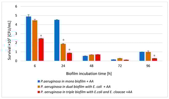 3.4. The P. aeruginosa Cell Count in Mono-, Dual- and Triple-Species Biofilms Untreated with AA