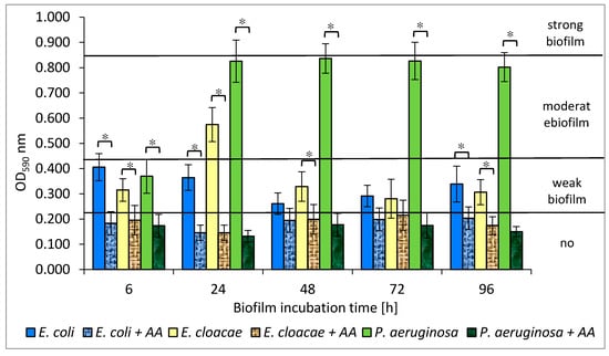 3.7. The E. coli Cell Count in Mono-, Dual-, and Triple-Species Biofilms Treated with AA