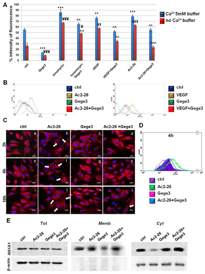 Analysis of Ca2+ mobilization and ANXA1 localization in HUVEC cells. (A) Effects of Gege3 10 μM, ionomycin 1 mM with and without Gege3, VEGF 10 ng/mL with and without Gege3, and Ac-2-26 1 μM with and without Gege3, all monitored using the probe Fluo-4 a.m. In the histogram blue bars refer to the cytometry analysis of cells in PBS 1× complemented with CaCl2 5 mM, red ones are related to the same experimental points evaluated in PBS 1× without calcium. (B) Representative scatter plots histograms of the cytometry analysis by Fluo-4 a.m. assay. The experimental points of ctrl (blue line), Ac2-26 1 µM or VEGF 10 ng/mL (brown line), and Gege3 10 µM alone (dark green line) and together (red line), in Ca2+ free PBS 1× are reported as indicated in the legend. (C) Immunofluorescence analysis to detect ANXA1 intracellular localization after 2 (panels a–d), 4 (panels e–h), and 16 (panels i–l) hours of treatments with Gege3 10 µM and Ac2-26 1 µM alone and together. Magnification 63 × 1.4 NA. Bar = 100 μm. (D) Cell surface expression of ANXA1 was analyzed by flow cytometry. The violet area in the plot is relative to not treated cells; the ANXA1 signal is shown in green after treatment with Ac2-26 1 µM, in pink with Gege3 10 µM, and in blue with both of them for 4 h. (E) Whole, membrane, and cytosol expression of ANXA1 in HUVEC cells treated or not for 8 h with Ac2-26 1 μM and Gege3 10 μM taken alone or together was analyzed by Western blot as described in the Materials and Methods section. Protein normalization and the check of the sample quality were performed on β-actin levels. Data are means ± standard deviation of three experiments with similar results. ** p < 0.01; *** p < 0.001 for treated cells vs. non treated control in buffer with Ca2+ 5 mM; ¥ p < 0.05; ¥¥ p < 0.01; ¥¥¥ p < 0.001 for treated cells vs. non treated control in buffer without Ca2+; ^^ p < 0.01; ^^^ p < 0.001 for treatments (ionomycin, VEGF and Ac2-26) with Gege3 vs. the same experimental points without Gege3, both with and without Ca2+.