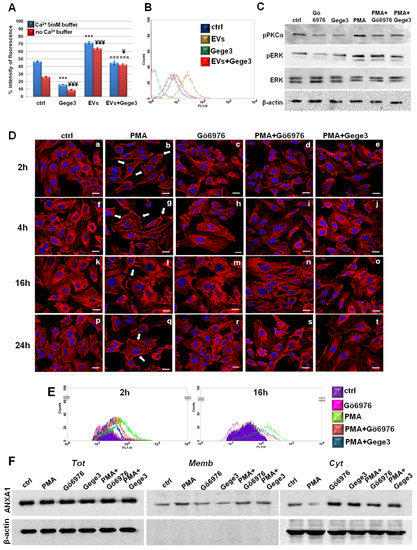 Endothelial cells answers to EVs in presence of Gege3 (A) Effects of Gege3 (10 μM), PC-derived EVs with and without Gege3, monitored using the probe Fluo-4 a.m. In the histogram blue bars refer to the cytometry analysis of cells in PBS 1× complemented with CaCl2 5 mM, red ones are related to the same experimental points evaluated in PBS 1× without calcium. Data are means ± standard deviation of three experiments with similar results. *** p < 0.001 for treated cells vs. non treated control in buffer with Ca2+ 5 mM; ¥ p < 0.05; ¥¥¥ p < 0.001 for treated cells vs. non treated control in buffer without Ca2+; ¤¤¤ p < 0.001 for EVs+Gege3 vs. EVs alone both in the presence and absence of Ca2+. (B) Representative scatter plot histogram of the cytometry analysis by Fluo-4 a.m. assay. The experimental points of ctrl (blue line), EVs (brown line), and Gege3 10 µM alone (dark green line) and together (red line), in Ca2+ free buffer, are reported as indicated in the legend. (C) Western blotting for pPKCα, pERK, ERK, normalized with β-actin on HUVEC cells treated with PMA 100 nM, Gege3 10 µM, Gö6976 1 µM, PMA+Gö6976, PMA+Gege3 for 15 min. Cropped blots from full-length gels are representative of three independent experiments with similar results. (D) Immunofluorescence analysis to detect ANXA1 intracellular localization after 2 (panels a–e), 4 (panels f–j), 16 (panels k–o), and 24 (panels p–t) hours of treatments with PMA 100 nM, Gö6976 1 µM, PMA+Gö6976, PMA+Gege3. Magnification 63 × 1.4 NA. Bar = 100 μm. (E) Flow cytometry analysis for cell surface expression of ANXA1. The violet area in the plot is relative to not treated cells; the ANXA1 signal is shown in pink with Gö6976 1 µM, in green after treatment with PMA 100 nM, in orange in presence of PMA+Gö6976, and in blue with PMA+Gege3 for 2 and 16 h. (F) Whole, membrane, and cytosol expression of ANXA1 in HUVEC cells treated or not for 8 h with the same treatments described above. The data are representative of four independent experiments with similar results.
