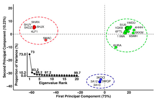 Principal component analysis (PCA) was performed using the Bio3D package [21] implemented in the R-Project and ProDy software [23,24]. The PCA was carried out on Cα atoms during the last 40 ns of the trajectories [52]. The correlated movements of the whole protein can be represented by the eigenvectors and eigenvalues. The eigenvectors, also called principal components (PC), gave the direction of the coordinated movement of the atoms, and the eigenvalues represented the magnitude of the movement along the corresponding eigenvectors [53]. Thus, PC1 and PC2 were computed, because they contributed more significantly to the PCA analysis [54].