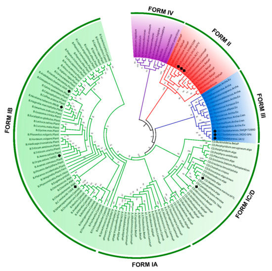 RuBisCO plays a key role in carbon fixation on Earth. This enzyme possibly evolved during the Archean Eon [65] from an ancestral non-carbon fixing enzyme long before the appearance of the Calvin–Benson–Bassham cycle [3,66]. Thus, our phylogenetic analysis (Figure 2) allows the different RuBisCO isoforms to be identified, supporting the idea that photosynthetic RuBisCO (form I, II and III) and RubisCO-like protein (RLP, Form IV) evolved from the same ancestral protein [67,68]. This would have allowed photosynthetic organisms to adopt different strategies to improve CO2 specificity (as in the Galdieria partita case) [69], increase intracellular CO2 concentration through a mechanism of carbon concentration [70], or inhabit ecological niches that have low levels of O2/CO2, such as in methanogenic organisms (as in the Methanococcoides burtonii case) [66].