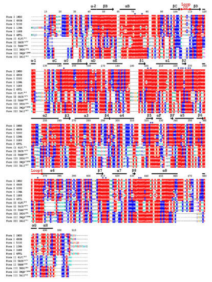 Multiple sequence alignment based on the structure of three isoforms of RuBisCO. Isoform I: O. sativa (1WDD), N. tabacum (4RUB), A. thaliana (5IU0), C. reinhardtii (1GK8), G. partita (1IWA) and S. marinoi (6FTL). Isoform II: 1 wild-type (4LF1WT) and 2 mutants (5HJXA47V and 5HANS59F) of R. palustris. Isoform III: 1 wild-type (3A12WT) and 2 mutants (3KDOSP6 and 3WQPT289D) of T. kodakarensis. Amino acid residue numbers are shown at the top of the sequence. Secondary structural elements, such as α-helices (bars) and β-strands (arrows), are shown in the figure. With an asterisk is depicted, it indicates mechanically important active site residues. Red background shading represents identical amino acids, blue shading designates similar amino acids while white shading indicates no similarity.