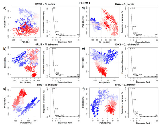 Principal component analysis of RuBisCO isoform I. (a) O. sativa (1WDD); (b) N. tabacum (4RUB); (c) A. thaliana (5IU0); (d) G. partita (1IWA); (e) C. reinhardtii (1GK8) and (f) S. marinoi (6FTL).