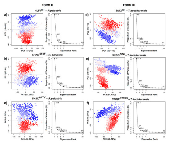 Principal component analysis of RuBisCO isoforms II (R. palustris) and III (T. kodakarensis). (a) 4LF1WT (R. palustris); (b) 5HANS59F (R. palustris mutant); (c) 5HJXA47V (R. palustris mutant); (d) 3A12WT (T. kodakarensis); (e) 3KDOSP6 (T. kodakarensis mutant); and (f) 3WQPT289D (T. kodakarensis mutant).