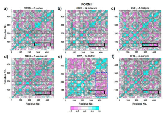 Cross-correlation analysis (DCCM) of RuBisCO form I. (a) O. sativa (1WDD); (b) N. tabacum (4RUB); (c) A. thaliana (5IU0); (d) G. partita (1IWA); (e) C. reinhardtii (1GK8) and (f) S. marinoi (6FTL). The color scale ranges from pink (for values ranging from −1 to −0.5) to white (−0.5 to 0.5) and to cyan (0.5 to 1).