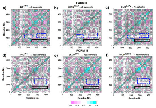 Cross-correlation analysis (DCCM) of RuBisCO form II (R. palustris) and III (T. kodakarensis). (a) 4LF1WT (R. palustris); (b) 5HANS59F (R. palustris mutant); (c) 5HJXA47V (R. palustris mutant); (d) 3A12WT (T. kodakarensis); (e) 3KDOSP6 (T. kodakarensis mutant); and (f) 3WQPT289D (T. kodakarensis mutant). The color scale ranges from pink (for values ranging from −1 to −0.5) to white (−0.5 to 0.5) and to cyan (0.5 to 1).