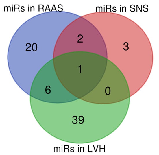 After reviewing the expression of miRNAs in RAAS, SNS and LVH in in vitro, in vivo and clinical studies, despite different methodologies applied in these works, it was possible to identify six miRNAs (miR-21 miR-155 miR-132 miR-29b miR-126 miR-212) with altered expression regulating RAAS and LVH processes. It was also possible to identify two miRNAs (miR-181a miR-135a) modulating the RAAS and SNS processes. No miRNA was identified associated with the SNS and LVH processes. However, one miRNA was observed to regulate all processes, the miR-133a (Figure 2).