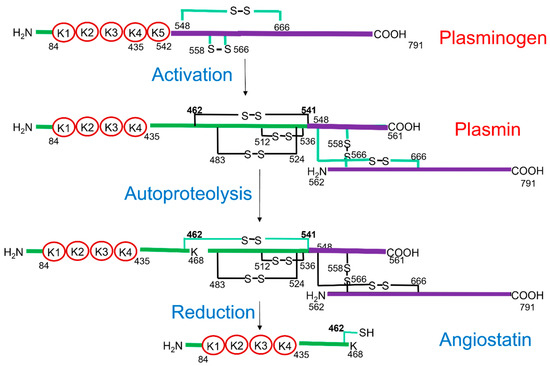- Kassam, G.; Kwon, M.; Yoon, C.S.; Graham, K.S.; Young, M.K.; Gluck, S.; Waisman, D.M. Purification and Characterization of A-61, an Angiostatin-like Plasminogen Fragment Produced by Plasmin Autodigestion in the Absence of Sulfhydryl Donors. J. Biol. Chem. 2001, 276, 8924–8933. [Google Scholar] [CrossRef] [PubMed]
