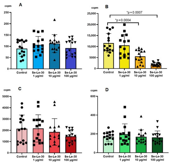 PBMCs from 15 healthy donors were separated by density gradient centrifugation on Histopaque-1077 (Sigma, Saint Louis, MO, USA). Samples were commercially obtained from the Regional Blood Centre in Warsaw. PBMCs (1 × 106 cells/well) were cultured in 96-well flat-bottom microplates in a RPMI 1640 medium (Gibco, Thermo Fisher Scientific, Waltham, MA, USA) containing 2 mM L-glutamine (Sigma, Saint Louis, MO, USA), antibiotic-antimycotic solution (1.5% penicillin-streptomycin-amphotericin, Invitrogen, Thermo Fisher Scientific, Waltham, MA, USA), and 10% fetal bovine serum (FBS, Gibco, Thermo Fisher Scientific, Waltham, MA, USA). PBMCs were stimulated with mitogens: anti-CD3 mAb (OKT3, 1 μg/mL, BD Pharmingen, San Diego, CA, USA), phytohemagglutinin (PHA, 20 μg/mL, Sigma, Saint Louis, MO, USA), or suspension of Staphylococcus aureus Cowan strain (SAC, 0.004% w/v, Calbiochem, San Diego, CA, USA), and incubated with the Se-Le-30 fraction in concentrations of 1, 10, and 100 µg/mL to repeat the pattern of our previous experiments [16]. As an additional control, an analogous test without any mitogens (autostimulation) was carried out. PBMCs were cultured for 72 h at 37 °C in a humidified atmosphere with 5% CO2. Cells were pulsed with a 1 μCi/well of [3H]-thymidine (113 Ci/nmol, NEN) for 18 h before the end of culture. When culture ended, cells were harvested, and the radioactivity was measured with a liquid scintillation counter (Wallac, PerkinElmer, Waltham, MA, USA), giving the level of radioactivity as ‘corrected counts per minute’ (ccpm). All experiments were performed in triplicates.