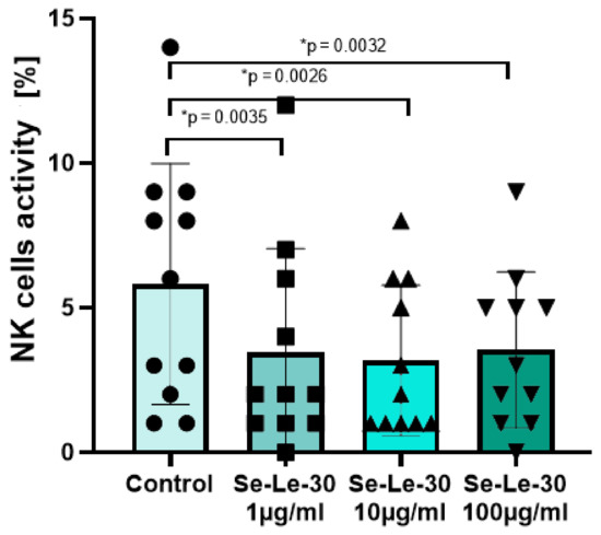 The effect of Se-Le-30 on the cytotoxic activity of human NK cells is presented in Figure 3. The study demonstrated that this Se-enriched polysaccharide significantly down-regulated the cytotoxicity of NK cells in the concentrations of 1, 10, and 100 µg/mL (p = 0.0039, p = 0.0039, and p = 0.0032, respectively).