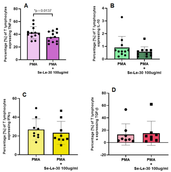 The effects of Se-Le-30 (100 µg/mL) on the percentage of CD3+ T lymphocytes producing tumor necrosis factor (TNF)-α (A), interleukin (IL)-10 (B), interferon (IFN)-γ (C), and transforming growth factor (TGF)-β (D). Statistical differences were considered when p < 0.05. The mean values (n = 12 for TNF-α, n = 11 for IL-10, n = 9 for IFN-γ, and n = 8 for TGF-β) and standard deviations are given. * p < 0.05 vs. control. For a detailed explanation of the gating strategy, please see Supplementary Figure S2.