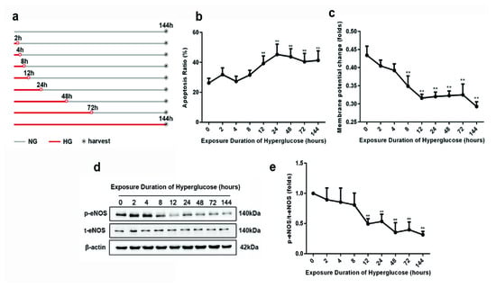 To study the progression of high-glucose-induced vascular injury, we used HUVECs with different high-glucose pre-incubation as a model. Following 8 h of high-glucose exposure, the mitochondrial membrane potential (MMP) significantly decreased gradually (Figure 1c). After 12 h of high-glucose exposure, the apoptosis ratio showed a significant rise (Figure 1b). Meanwhile, the eNOS phosphorylation at serine 1177 declined (Figure 1d,e). These data suggest that vascular injury can develop very soon after high-glucose exposure.