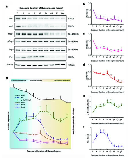 The three stages of mitochondrial fusion/fission balance during high-glucose-induced vascular injury. (a–f) Expression levels of mitochondrial fusion/fission proteins. (g) Summary of the sustained effects of different high-glucose exposure times on MMP, expression of mitochondrial dynamic proteins, and cellular apoptosis assay. Data are expressed as the mean ± SEM. n = 3 for each group. * p < 0.05, ** p < 0.01 vs. the normal-glucose group.