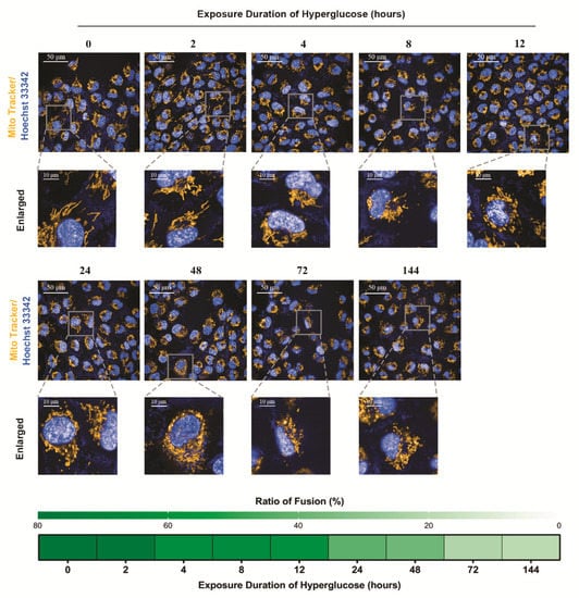 To examine whether the alteration of mitochondrial morphology coincided with the changes of mitochondrial fusion and fission proteins, we performed mitochondrial morphology visualization at the 144 h endpoint for all glucose stimulation groups (Figure 3). With the extension of high-glucose exposure, mitochondria gradually became fragmentary, which was consistent with the changes of mitochondrial fusion and fission proteins.