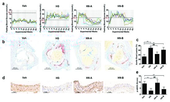 High-glucose-induced vascular injury in vivo. (a) The fasting blood glucose of mice. (b,c) Oil red staining and quantitative analysis of atherosclerotic lesions at the aortic root. (d,e) Immunohistochemical staining and quantification of p-eNOS on abdominal aortic sections. Data are expressed as the mean ± SEM. n = 6 for each group. ** p < 0.01 vs. control (the Veh group); ## p < 0.01 vs. HG.