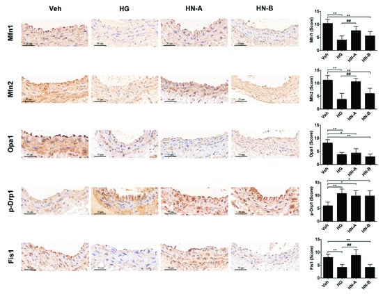 Immunohistochemical staining and quantification of mitochondrial fusion/fission proteins in abdominal aortic sections. Data are expressed as the mean ± SEM. n = 6 for each group. * p < 0.05, ** p < 0.01 vs. control (the Veh group); ## p < 0.01 vs. HG.