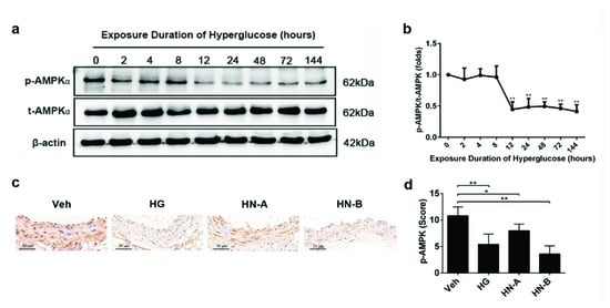 Adenosine monophosphate-activated kinase (AMPK) phosphorylation was suppressed during high-glucose-induced vascular injury both in vitro and in vivo. (a,b) AMPK phosphorylation in HUVECs with different high-glucose exposure times. Data are expressed as the mean ± SEM. n = 3 for each group. * p < 0.05, ** p < 0.01 vs. normal-glucose group (the 0 h group). (c,d) Immunohistochemical staining and quantification of p-eNOS on abdominal aortic sections. Data are expressed as the mean ± SEM. n = 6 for each group. * p < 0.05, ** p < 0.01 vs. control (the Veh group).