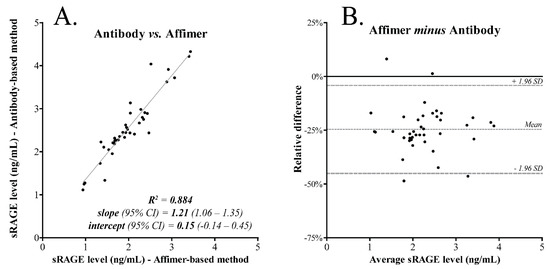 Comparison between an affimer-based sRAGE LC-MS assay and a previously developed antibody-based LC-MS method for sRAGE analysis in 40 serum samples. (A) correlation between results by linear regression and (B) bias by Bland−Altman plot (reproduced with permission from [82]).