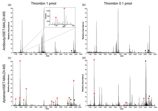 Lee et al. [90], using matrix-assisted laser desorption/ionization (MALDI) MS, studied the affinity enrichment of thrombin by an aptamer and an antibody while immobilised on beads. MALDI MS analysis of the tryptic digest resulting from the aptamer-based enrichment resulted in more thrombin-derived peptides and a reduced background when compared to the antibody-based method. Additionally, thrombin was detected at a lower concentration with the aptamer-based approach, while it was undetectable at the same concentration with the antibody-based enrichment approach (Figure 5).