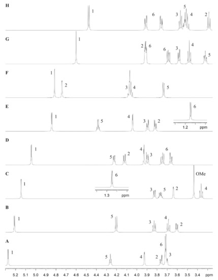 Simulated 1H NMR spectra of the sugar units (A–H) of the B. fragilis wild-type O-glycan released from glycopeptides. The traces A–H show the individual spin systems together with the assignment of the sugar protons. OMe, O-methyl.