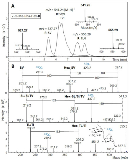 (A) Overlaid extracted ion chromatograms of PGC-LC-ESI-MS analysis of B. fragilis ΔBF4306 glycopeptides obtained by PCG-HPLC fractionation. A mass of 527.27 Da indicates glycopeptide 2-O-Me-Rha-Hex-Ser-Val (fraction f28), of 541.24 Da glycopeptide 2-O-Me-Rha-Hex-Ser-Leu/Ile or 2-O-Me-Rha-Hex-Thr-Val (fraction f32), and of 555.29 Da glycopeptide 2-O-Me-Rha-Hex-The-Leu/Ile (fraction f36). Small insets show the respective MS1 spectrum. (B) The corresponding MS2 spectra confirm the glycopeptide nature of B. fragilis ΔBF4306 glycopeptides f28, f32, and f36 as obtained by PGC-HPLC separation and fractionation in the previous purification. The spectra exhibit prominent peaks from cross-ring cleavages. Peaks explicable by rearrangements—as frequently observed in positive mode fragment spectra—are labeled with italic numbers. Cross-ring fragments indicated in blue are described as proposed by Domon and Costello [47].