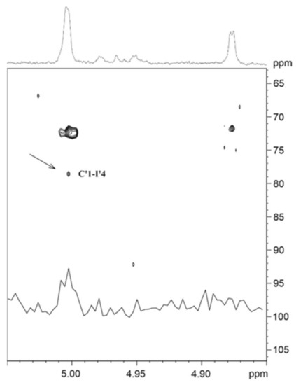 The inter-glycosidic linkage information was derived from appropriate cross-peaks in a 2D HMBC experiment (Figure 3A), assisted by a 2D NOESY spectrum (Figure 3B). Further confirmation was obtained from the 13C chemical shift, as the involved carbons should exhibit a down-field shift up to 10 ppm due to glycosylation (Table 2). Residue A had an HMBC cross-peak from H-1 to C-3 of building block F (Figure 3A). All carbons except C-1 had chemical shifts in the range of unsubstituted carbons.
