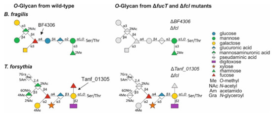 Comparison of the O-linked glycan structures from B. fragilis wild-type (this study), B. fragilis ΔBF4306 (this study), B. fragilis Δgmd-fclΔfkp [16], T. forsythia wild-type [10], T. forsythia ΔTanf_01305 [10], and T. forsythia Δfcl (this study). The severe truncation of the glycans upon deletion of the fucT or the fcl gene is indicated in grey. Glycan structures are drawn according to the symbol nomenclature of glycans SNFG [48].
