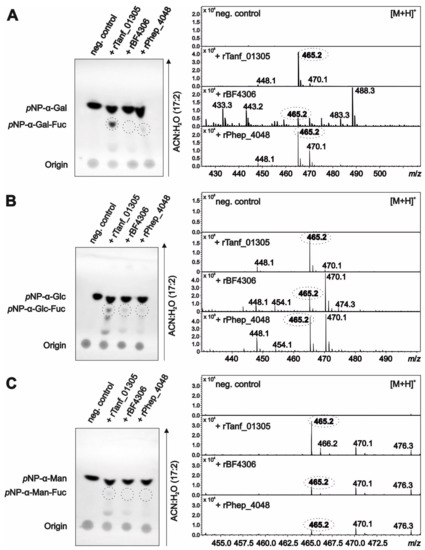 All enzymes were tested for their ability to fucosylate different pNP-hexose acceptor substrates, including pNP-α-Gal, pNP-α-Glc and pNP-α-Man and, in addition, pNP-α-GlcA (GlcA is the attachment site of the second Fuc in the T. forsythia O-glycan structure; Figure 8), pNP-β-Xyl and pNP-β-GlcNAc (negative controls), with GDP-l-Fuc serving as the Fuc donor. All three enzymes transferred l-Fuc to pNP-α-Gal (Figure 11A), pNP-α-Glc (Figure 11B), and pNP-α-Man (Figure 11C), albeit with different preferences according to semiquantitative detection of the reaction products on TLC plates and by ESI-MS, evidenced by m/z of pNP-Hex-Fuc = 465.2 [M + H]+. Low activities could be due to the recombinant form of the proteins and/or suboptimal reaction conditions. rTanf_01305 transferred an l-Fuc residue to all three tested acceptor substrates with pNP-α-Gal as the best substrate—confirming reactivity on its native acceptor in the T. forsythia O-glycan—and pNP-α-Man as the least favorable substrate (pNP-α-Gal > pNP-α-Glc > pNP-α-Man). rBF4306 demonstrated very low activity with all substrates; pNP-α-Glc was the best substrate, which is in agreement with the finding that l-Fuc is linked to a Glc residue in the B. fragilis O-glycan structure (Figure 8). rBF4306 also demonstrated slight transfer to pNP-α-Man substrate, while only traces of modified pNP-α-Gal were detected. However, cross-complementation showed that in the native organism, BF4306 complements the function of Tanf_01305. rPhep_4048 showed comparable preferences for the pNP-hexose acceptor substrates as rTanf_01305, but was only minimally active. The structure of the P. heparinus glycan has not been determined and therefore its natural preferred substrate is unknown; however, these data combined with the cross-complementation data suggest that rPhep_4048 links l-Fuc to a hexose residue of its O-glycan. Neither pNP-α-GlcA, pNP-β-Xyl, nor pNP-α-GlcNAc was a suitable acceptor substrate for any of the three enzymes (Figure S10).