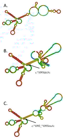 Predicted RNA folding with either the wild tipe (A), loss (B) or gain (C) of rs17016074 for a 300 bp region surrounding the SNP. Structures are obtained from the RNAfold server http://rna.tbi.univie.ac.at/cgi-bin/RNAWebSuite/RNAfold.cgi. (accessed at 26 September 2021).