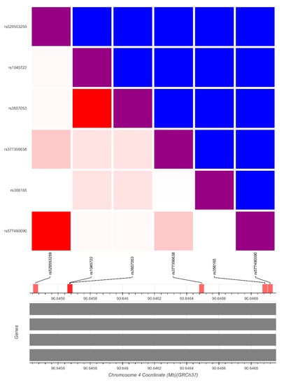 Linkage disequilibrium (LD) structure and physical gene map of the SNCA gene. Blue cells represent D′ correlation; red cells represent R2 correlation. Red cells indicate strong LD; pink cells-intermediate or ambiguous; white cells—evidence for historical recombination. Analysis of linkage disequilibrium of identified variants in the 3′ UTR region of SNCA gene performed via LDmatrix Tool (https://ldlink.nci.nih.gov; accessed at 26 September 2021).