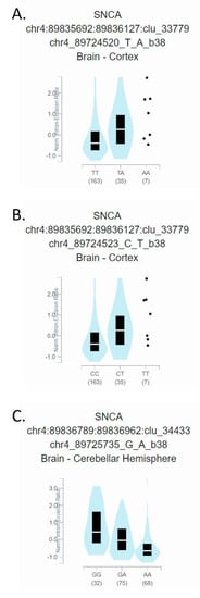 Figure is processed from GTeX (https://www.gtexportal.org; accessed at 26 September 2021 Data Source: GTEx Analysis Release V8 (dbGaP Accession phs000424.v8.p2)), and represent the splicing quantitative trait locus (sQTL) effects of: (A). rs1045722 in the 3′ UTR of SNCA and (B). rs3857053 in the 3′ UTR of SNCA in cortex and (C). rs356165 in the 3′ UTR of SNCA cerebral hemisphere.