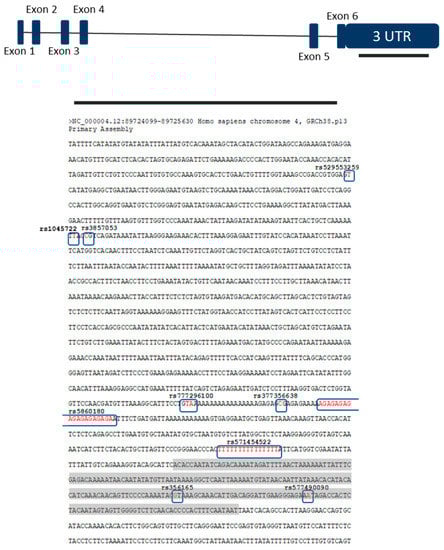 Alternative cleavage and polyadenylation are known to produce a great number of SNCA transcripts, which are thought to have a length of 3′ UTR ranging from 290 to 2520 nucleotides [nt] [,]. Moreover, some studies associated single nucleotide polymorphisms found in the 3′ UTR SNCA gene with a greater accumulation of long 3′ UTR transcripts resulting in an increase in α-synuclein protein levels [,]. Other studies showed a connection between SNCA 3′ UTR length and PD risk [,]. The analysis of variants in the 3′ UTR region is complicated by the fact that the length of the region itself is still not completely clear. A recent study identified α-synuclein transcript having a much longer 3′ UTR, with additional 1246 nt []. They validated their results in postmortem human brain samples and iPSCs-derived dopaminergic neurons (induced Pluripotent Stem Cells), as well as various human neuronal cell lines [], questioning what other variants are also part of the 3′ UTR region. Moreover, RNA-seq data uncovered a vast number of previously unannotated 3′ UTR extensions in mice and human [], while longer transcripts have been shown to be exclusive to brain tissue [,]. Thus, this region is interesting because of its role in translation control and genetic variants in 3′ UTR can affect miRNA activity and consequently alter the translation process [,]. The aim of this study was to assess differences in 3′ UTR variants of SNCA genes in a cohort of PD patients and control subjects from Croatia.