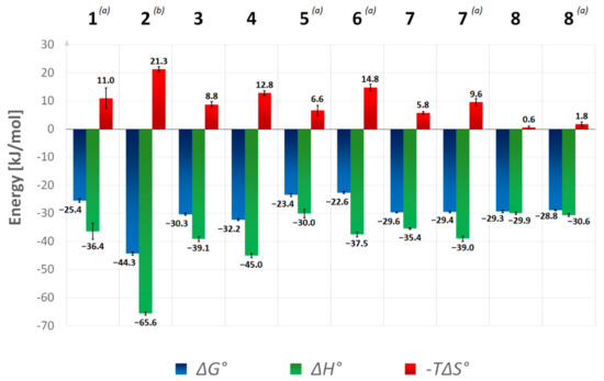 | 8 | 7.5 ± 1.4 (a) | −29.3 ± 0.4 (a) | −29.9 ± 0.4 (a) | 0.6 ± 0.4 (a) | direct (a) |