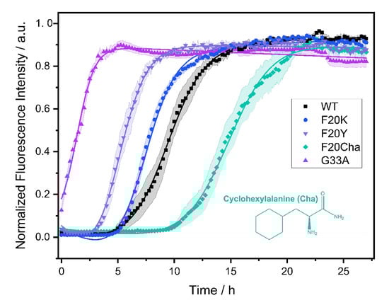 To first determine the effect of the mutation on the fibrillation process, we performed fibrillation kinetics measurements. Most of the tested mutants showed a shorter lag time and characteristic time compared to the WT Aβ peptide. The explanation of the partly drastic alteration of the fibrillation kinetics, especially in the Gly33Ala mutant, lies in the modification of the folding energy landscape resulting in an acceleration of kinetically relevant steps by destabilizing specific oligomeric structures and/or the emergence of alternative pathways with different oligomers [3,4,41]. The kinetics data suggest an importance of positions Phe20 as well as Gly33 for fibril growth and the formation and/or stabilization of intermediate species.