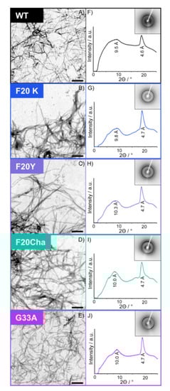 A more detailed view on the global structure of the mutated Aβ40 fibrils was provided by X-ray diffraction. X-ray diffraction data of all Aβ40 peptides is presented in Figure 2F–J. All Aβ mutants featured similar XRD spectra as the WT peptide and prove that the cross-β structure of amyloids, which is formed by two stacked β-sheets, is formed by all mutated peptides. In particular, the spectra show a strong meridional reflection at ~4.7 Å, indicating the intrasheet distance between the neighboring β-strands corresponding to the hydrogen bond length and a broader equatorial reflection from ~9.5 to 10.3 Å indicating the distance between the two opposing β-strands. The meridional reflection in all variants was well-defined at 4.6 or 4.7 Å in agreement with the regular β-sheet structure of the WT and mutated fibrils. The more diffuse equatorial reflection was observed in WT fibrils at approximately 9.5 Å and in the mutants at 9.8 Å (Phe20Lys), 10.0 Å (Phe20Cha; Gly33Ala) and 10.3 Å (Phe20Tyr).