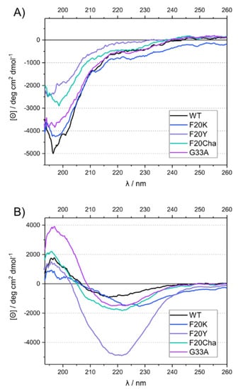 Both amino acids are located in direct proximity to the Phe19/Leu34 contact but the Phe20 side chain points out of the fibril core according to the current models of Aβ40 [19,20,21,22]. It should be mentioned that there is also one model describing the Phe20 side chain to point into the fibrillar core [21]. Any side chain that is introduced into position 33 should also point outwards. The residues chosen to replace Phe20 were (i) Lys, (ii) Tyr and (iii) the non-proteinogenic cyclohexylalanine (Cha). With this choice of side chains, we were able to first study the effect of electrostatics by introducing the positively charged Lys; second, the possibility to adopt an altered hydrogen bond pattern by introducing aromatic Tyr; third, the role of π stacking and aromaticity by mutation to cyclohexylalanine (Cha) where the aromatic phenyl ring is replaced by the saturated cyclohexyl moiety. The mutation introduced to replace Gly33 was Ala, which represents the most conservative mutation in this position. Therefore, we aimed to obtain a detailed view on the role of this amino acid within the structure of the Aβ40 peptide assembly to assess if it might be worth further investigations.