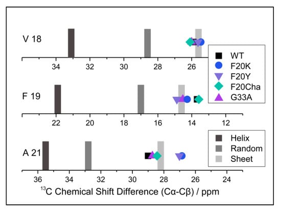 To examine the local structure of mutated Aβ40, peptide variants with 13C/15N-labels at selected positions (Val18, Phe19 and Ala21) were fibrillated and studied using solid-state NMR spectroscopy. For all samples, we obtained well-resolved one-dimensional 13C CP MAS NMR spectra. The corresponding NMR spectra featured relatively well-resolved NMR lines indicating moderate polymorphism in the local structure. We were able to assign all chemical shift values to the labeled carbons from the two-dimensional 13C–13C correlation NMR spectra (DARR experiment). These chemical shifts represent a measure of the local secondary structure since the dihedral angles of the peptide backbones influenced the magnetic environment of the nuclei, especially the 13Cα, 13Cβ and 13CO position [32]. To be independent of external referencing, 13Cα–13Cβ chemical shift differences [33] were calculated and are shown in Figure 4. Specific values for the respective amino acids indicating secondary structure motifs are also displayed. As apparent from Figure 4, WT Aβ40 fibrils featured well-defined β-sheet structure for the reported amino acids in agreement with the current models for Aβ40 fibrils [19,20,21,22]. All mutated variants did not show substantial deviations from the WT Aβ secondary structure for the reported amino acids. All determined values were in agreement with β-sheet structure.