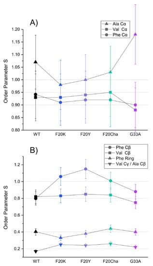 Segmental order parameters for the labeled segments are illustrated in Figure 5 for the backbone (A) and side chain carbons (B). No major differences in the order parameters of the labeled amino acids were observed between WT Aβ40 fibrils and the different mutants, proving again that the local structure of the fibrils as the final product of the folding pathway is mostly unaffected by the introduced perturbations.