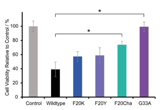 The results of the MTT assay reveal great differences in the peptide toxicity between WT Aβ40 peptides and all tested mutants. As expected, and in agreement with the literature data, the WT peptide was highly toxic and led to a relative cell viability of 39.2 ± 10.3%. All mutations caused a severe decrease or loss of cell toxicity. The Phe20 Aβ40 mutants were still toxic but to a lesser extent with a relative cell viability of 57.4 ± 7.0% for Phe20Lys, followed by 58.9 ± 10.8% for Phe20Tyr and 74.0 ± 4.6% for Phe20Cha. The variant Gly33Ala almost completely lost cell toxicity with a relative cell viability of 99.3 ± 6.8%.