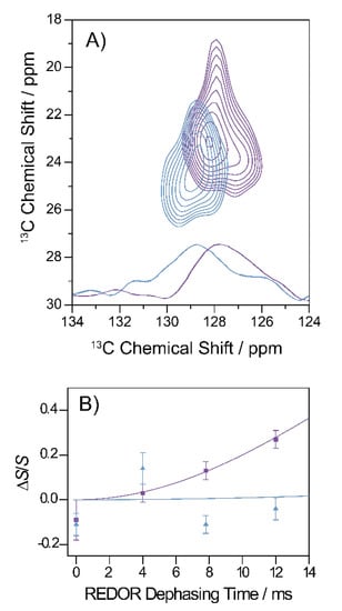 13C-15N frequency selective REDOR experiments [30] were conducted on a Bruker Avance III 700 MHz spectrometer at an MAS frequency of 8.333 kHz. 13C π pulses were 10.5 µs and the carbonyl selective pulse was 500 µs long. ΔS/S curves were simulated assuming only an isolated 13C-15N contact.
