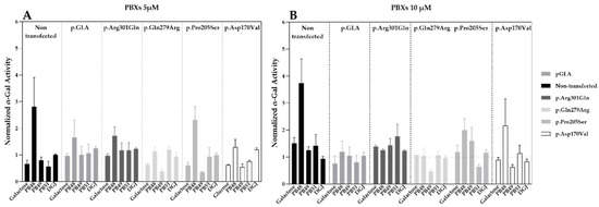 Hek cells were transfected with plasmids that encode wild type α-GalA (pGLA) or mutated isoforms of the enzyme (i.e., p.Asp170Val, p.Pro205Ser, p.Gln279Arg, p.Arg301Gln) with affected protein folding. Then, cells were treated with PBX compounds, galactose, or DGJ at concentrations of 5 or 10 µM for 72 h.