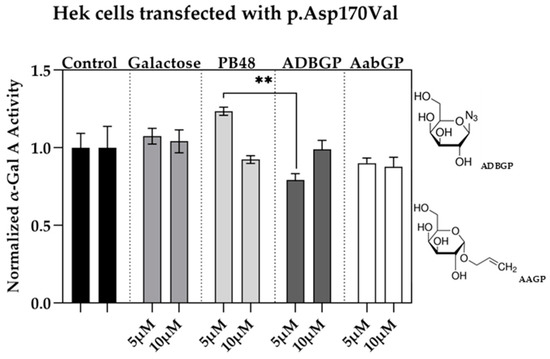 Galactose analogues with substituents in position 1 inhibit α-GalA activity in Hek cells transfected with p.Asp170Val variant. Activity of α-GalA assessed in Hek 293T cells transfected with p.Asp170Val variant, which affects the active site, and treated with ADBGP, AABGP, PB48, or galactose at concentrations of 5 and 10 μM. The histograms represent mean normalized activity values for each treatment, taking non-treated control activity value as reference. Error bars represent ± SEM. Statistical significance was assessed by Kruskal–Wallis test (** p ≤ 0.005). The structures concerning galactose analogues ADBGP and AABGP are also represented.