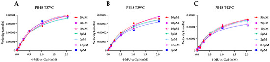 PB48 stabilizes α-GalA when increasing temperature. Interpolated Michaelis–Menten curves with the velocity of 4MU-α-Gal substrate cleavage reaction against substrate concentration. α-GalA was preincubated with PB48 (0–50 μM) at the temperatures of 37 °C (A), 39 °C (B), and 42 °C (C). Error bars represent SEM. The reaction in presence of PB48 at the temperature of 39 °C or 42 °C is faster than the reaction carried out in the absence of the compound.